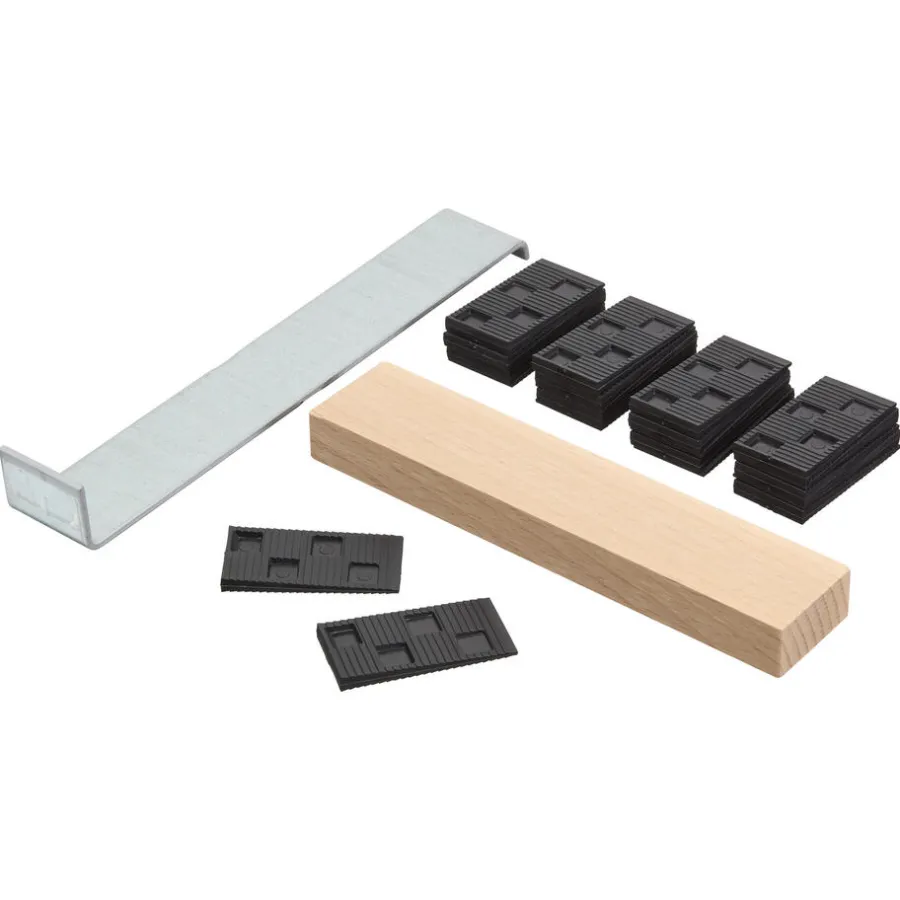 Laminaat legset 3-delig. Hielijzer, aanslagblok en 20 afstandspietjes voor het leggen van laminaat/parket.SpecificatiesA…