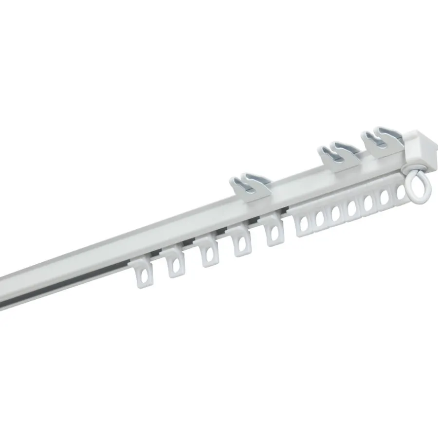Gordijnrailset wit op maat 100 cm lang van aluminium. Complete set inclusief rails, eindstukjes, steunen en glijders. Plaats 1 steun om de 50 cm en 10 glijders per 100 cm. Rails aan de muur plaatsen? Gebruik afstandsteunen